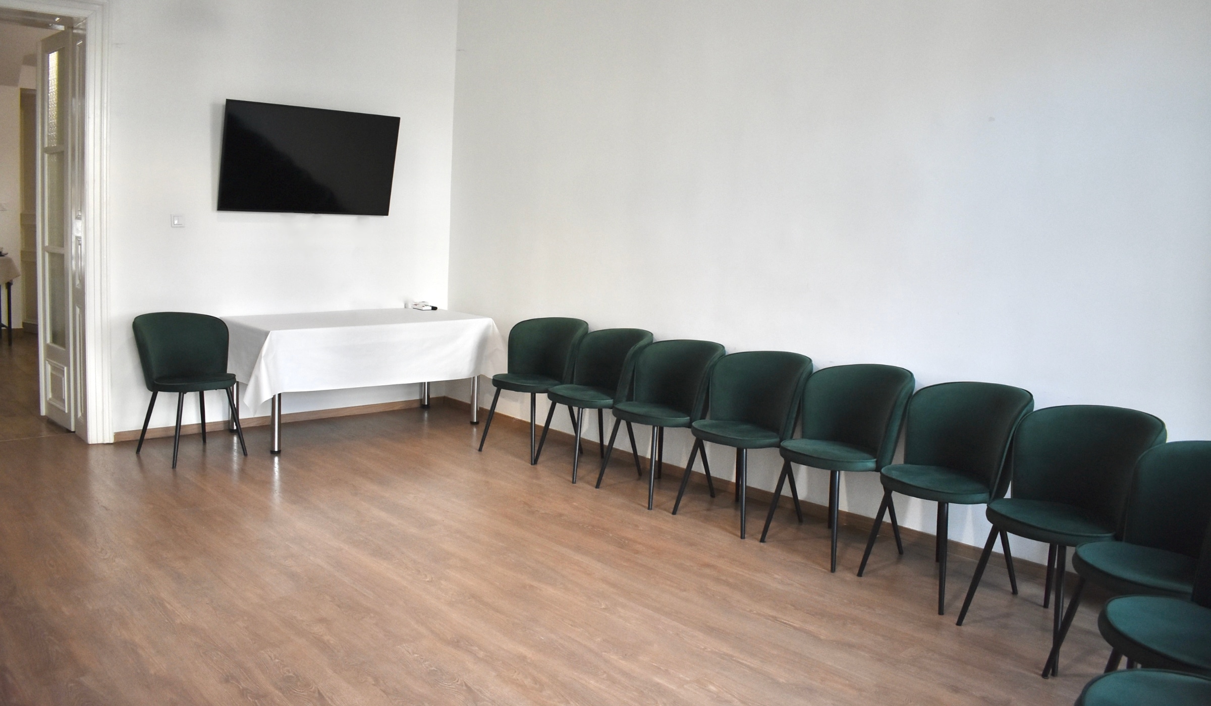 The 30 m² Herczeg Right Room offers a warm, welcoming setting ideal for corporate events, workshops, and courses up to 22 participants. The meeting room includes heating and cooling, large street-facing windows with all-day natural light, a large smart TV, and comfortable velvet chairs for a relaxed, modern environment.